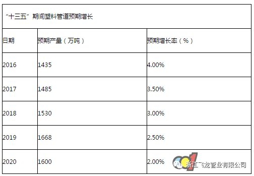 《中國塑料管道行業(yè)“十三五”期間(2016-2020)發(fā)展建議》認(rèn)為,“十三五”期間是塑料管道行業(yè)發(fā)展中的重要時(shí)期,在**相關(guān)政策的帶動(dòng)下,近年來國內(nèi)塑料管材業(yè)發(fā)展呈現(xiàn)強(qiáng)勁增長(zhǎng)態(tài)勢(shì),成為國內(nèi)塑料加工業(yè)的主力軍?!笆濉逼陂g,塑料管道生產(chǎn)量將保持在3%左右的年均增長(zhǎng)速度,到2020年,預(yù)期塑料管道長(zhǎng)度在各類材料管道中平均市場(chǎng)占有率超過55%。各種政策和數(shù)據(jù)表明,管材行業(yè)的寒冬已近尾聲,后期發(fā)展值得期待。金聯(lián)創(chuàng)訊(市場(chǎng)分析師:朱秋平)